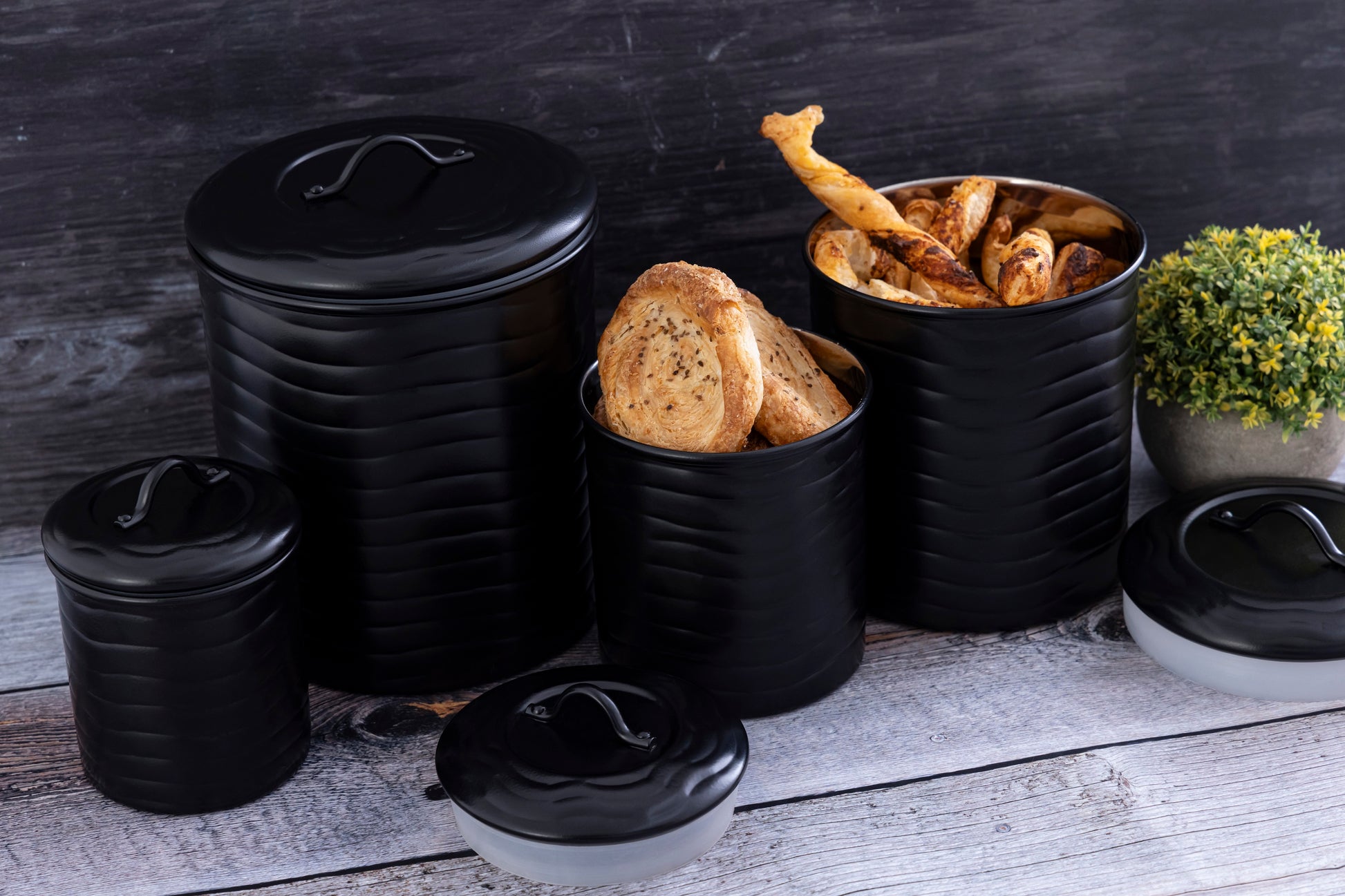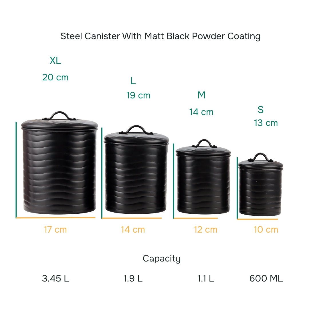 - Kitchen Storage Canister Set Includes Large, Medium, Small & Extra Small Sizes with Matt Black Powder Coating Steel