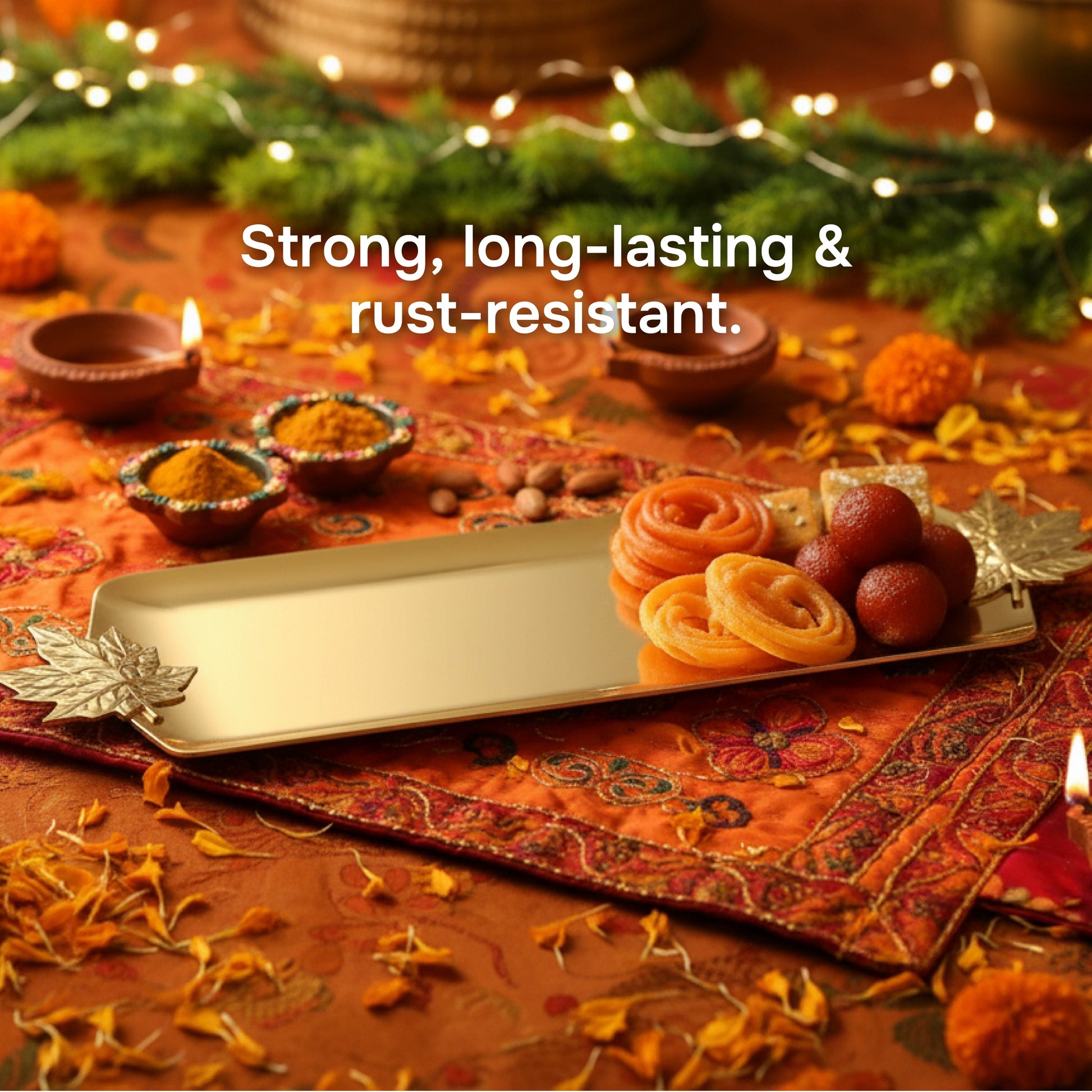 - ELEGANT FESTIVE DÉCOR: Add a luxurious touch to your home with this beautifully crafted aluminium tray in a rich gold finish. Ideal for Diwali, Raksha Bandhan, Karwa Chauth, weddings, and housewarming celebrations.