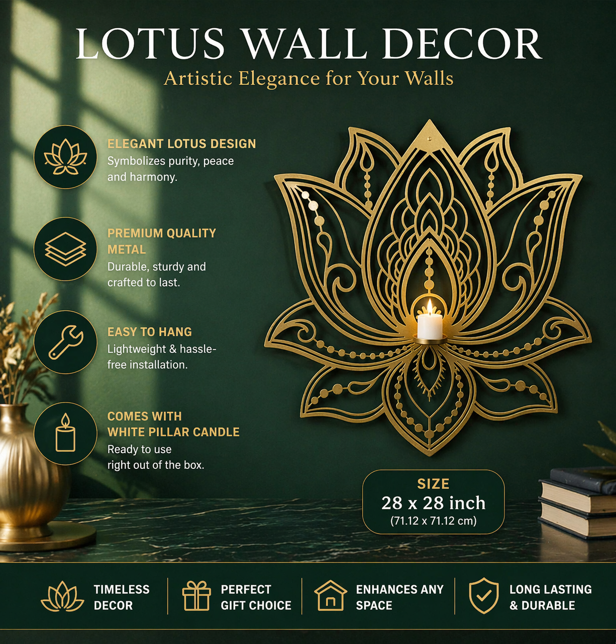 - Iron Wall Hanging Lotus with Pillar candle Stand & Brass Finishing.