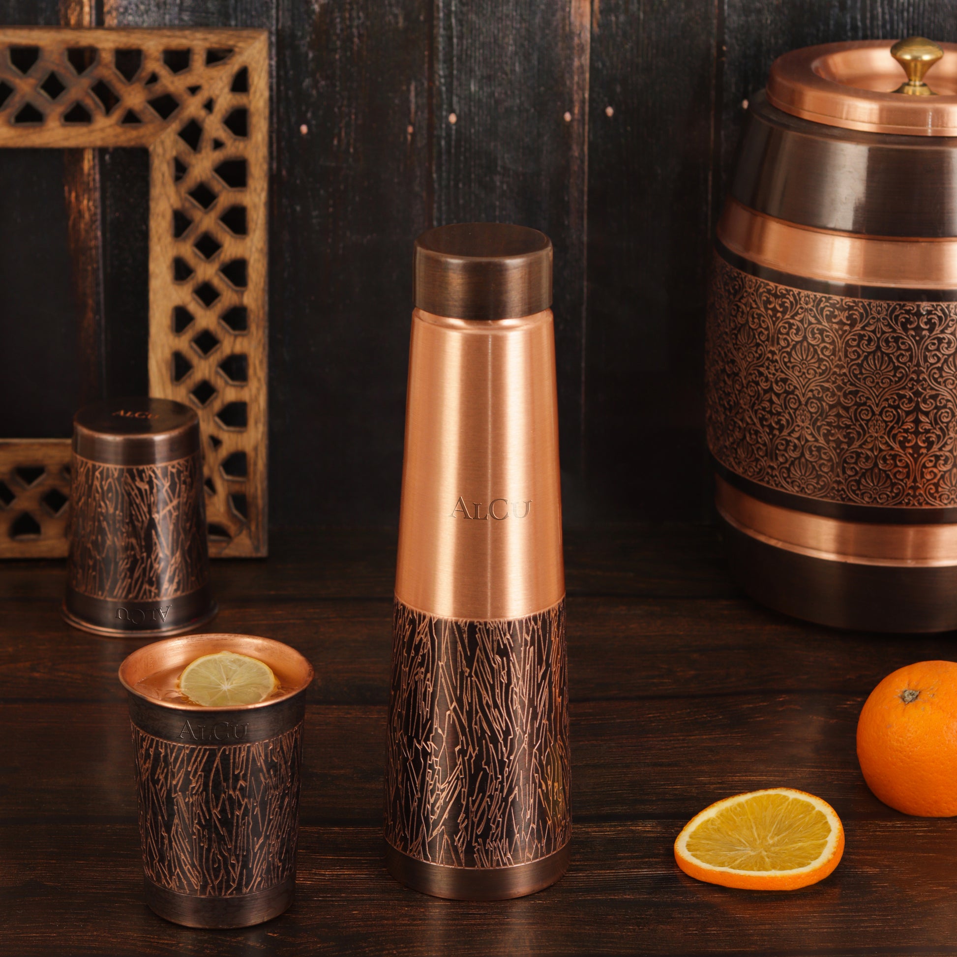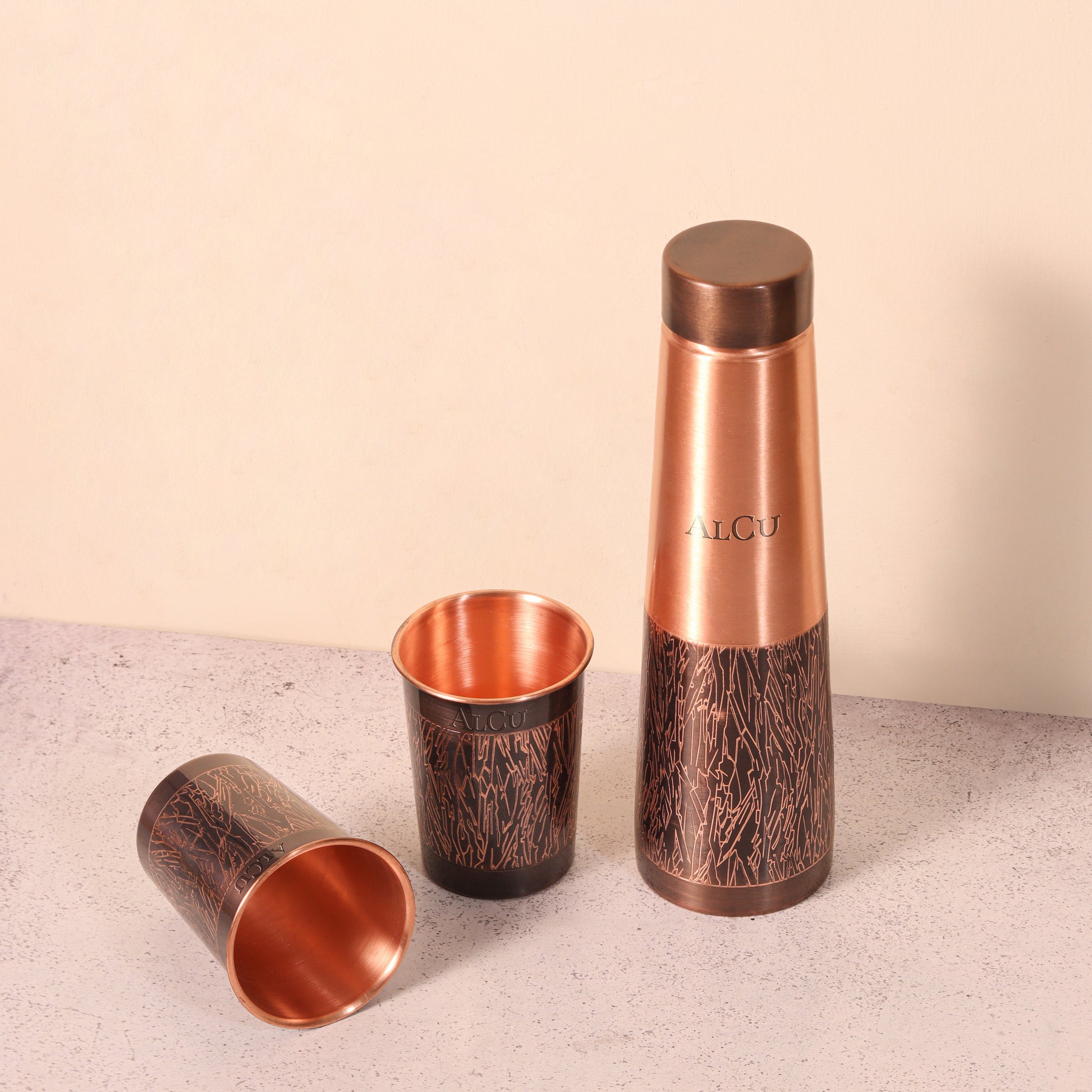 Elegant Pairing: Includes a sleek copper bottle and two matching copper glasses, perfect for a complete and stylish drinking experience.